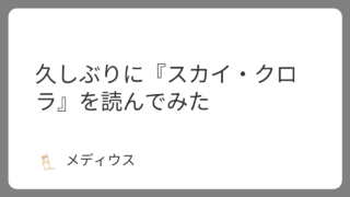 本 久しぶりに『スカイ・クロラ』を読んでみた 先日本棚の整理をしていると懐かしい本が出てきた。『スカイ・クロラ』工学博士でもある小説家森博嗣氏が執筆した至高の本だ。透明なカバーに心を奪われて私がこの本に出会ったのは今から約10年程前。何か面白そうな本はないかと本屋をうろうろしている時美... 2013.01.17 本