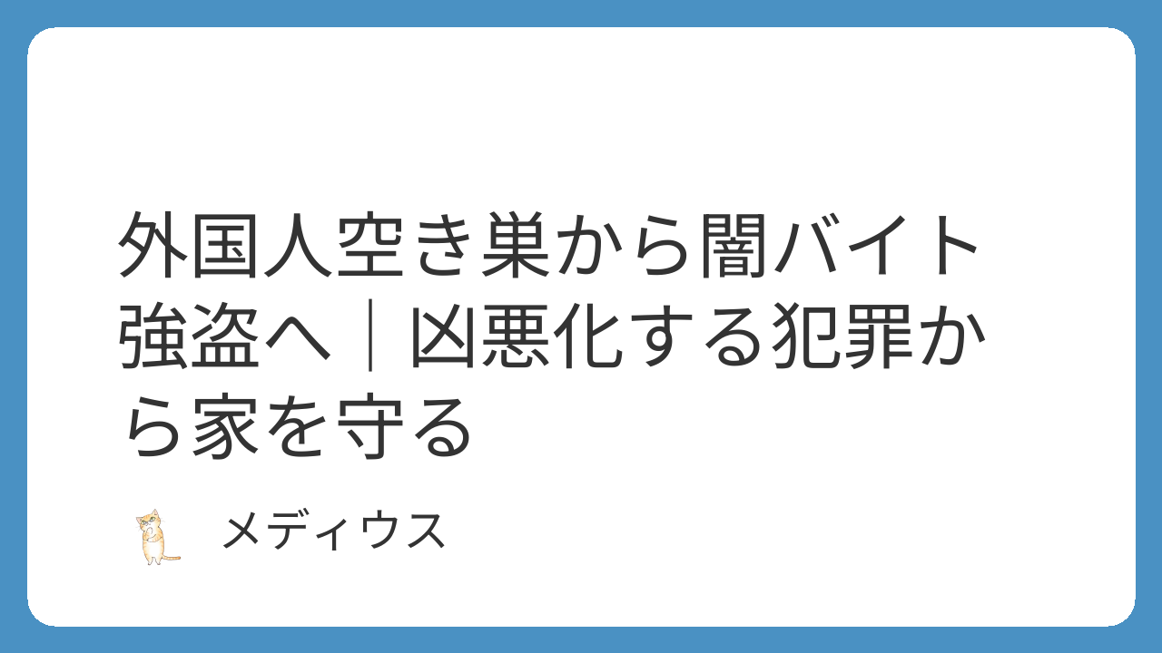 当時、空き巣(侵入窃盗)の認知件数は年間約10万7千件。私の近所でも去年と今年で3件も発生していた。特に外国人による犯行は、日本人と違い「顔を見られたら殺した方がいい」と判断するほど凶悪だとされ、私はその計画性・凶悪性に強い危機感を抱いていた。